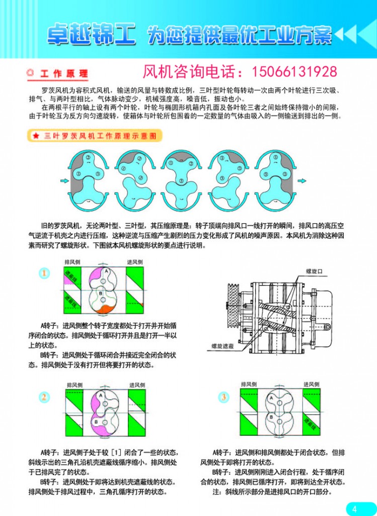 羅茨鼓風(fēng)機屬于容積式風(fēng)機,輸送的風(fēng)量與轉(zhuǎn)數(shù)成比例, 三葉羅茨鼓風(fēng)機原理是:三葉型葉輪每轉(zhuǎn)動一次由 2 個葉輪進(jìn)行 3 次吸、排氣,與二葉型相比,氣體脈動變少,負(fù)荷變化小,機械強度高,噪聲低,振動也小。在 2 根平相行的軸上設(shè)有 2 個三葉型葉輪,輪與橢圓形機箱內(nèi)孔面及各葉輪三者之間始終保持微小的間隙,由于葉輪互為反方向勻速旋轉(zhuǎn), 使箱體和葉輪所包圍著的一定量的氣體由吸入的一側(cè)輸送 到排出的一側(cè)。各支葉輪始終由同步齒輪保持正確的相位, 不會出現(xiàn)互相碰觸現(xiàn)象,因而可以高速化,不需要內(nèi)部潤滑, 而且結(jié)構(gòu)簡單,運轉(zhuǎn)平穩(wěn),性能穩(wěn)定,適應(yīng)多種用途,已運用于廣泛的領(lǐng)域。2什么是羅茨風(fēng)機