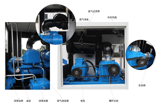 以錦工雙螺桿鼓風機為例,螺桿風機一般主要由外罩、主機、電機、空氣過濾器、消音器、油泵油箱以及油慮等部分構成。錦工雙螺桿鼓風機可根據客戶要求進行定制,比如去掉外罩、改為無油系統等。
