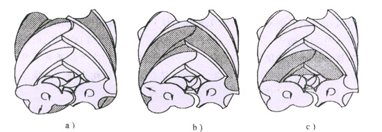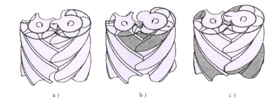 螺桿式風機的運行原理是兩根平行的陰陽轉子在“∞”形氣缸中相互嚙合形成工作容積,通過同步齒輪,轉子作反向高速轉動,隨著轉子轉動工作容積的大小發生周期性的變化,在氣體輸送過程中同時實現氣體的壓縮。螺桿式風機的工作循環可分為吸氣、壓縮和排氣三個過程。其循環過程如下所示:
