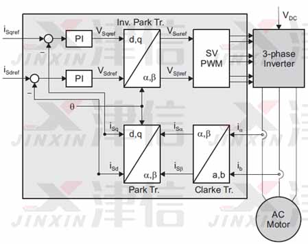 V/F方式是早期變頻器驅動永磁同步電機的控制方式之一,這種方式需要放大變頻器的功率,將永磁同步電機當作普通的交流異步電機,只做簡單的壓頻比控制。同時,對永磁同步電機的感應電勢波形要求較高,電機電流中含有不合理的磁場電流成分,無法體現出永磁同步電機高效節能的優勢,還容易造成失速、過流等問題,因此現在已經不推薦使用了。
