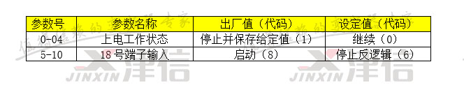 2.外部12 ,18號端子接起停控制開關。 3. 通過面板按下面的參數分別在0號菜單設置上電工作狀態,5號菜單設置18號端子輸入值。